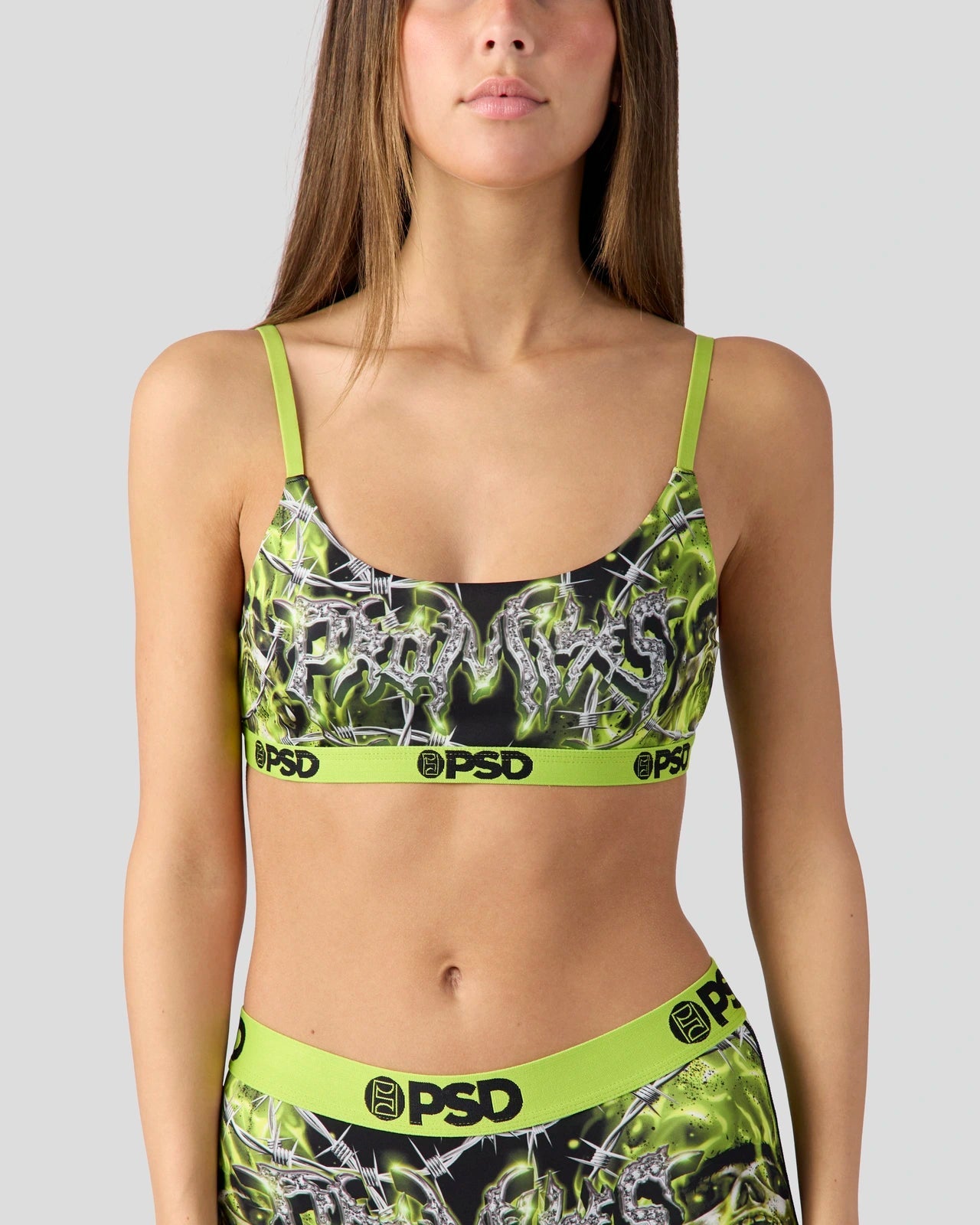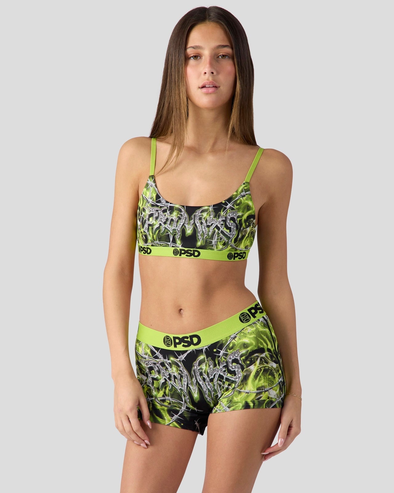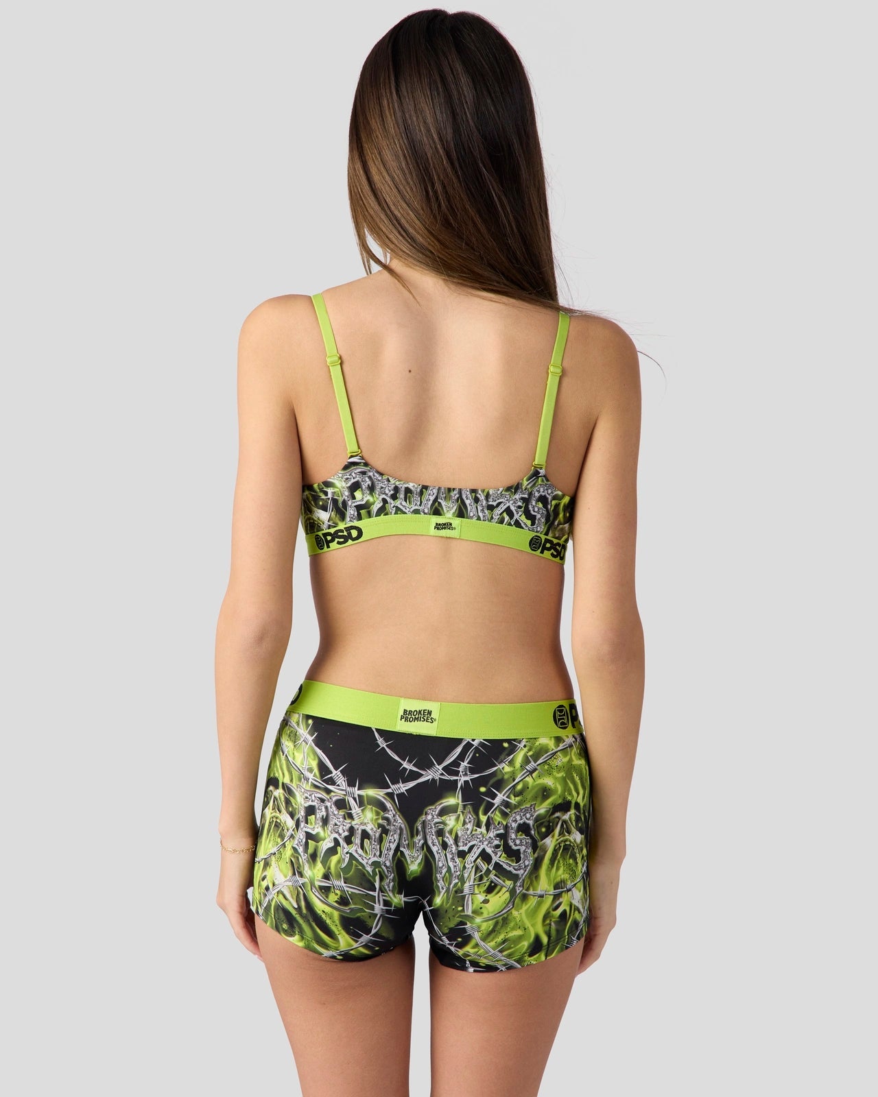 Our first collaboration with Broken Promises is here. Featuring their barbwire print. the Cyberwire Scoop Bralette almost feels like you’re not wearing a bra at all. It’s fully lined and features include adjustable straps. a cute scoop neckline. and a soft microfiber band that won’t ride or rub.
