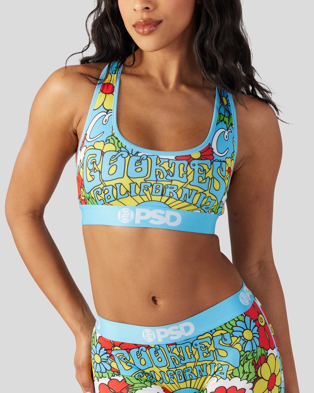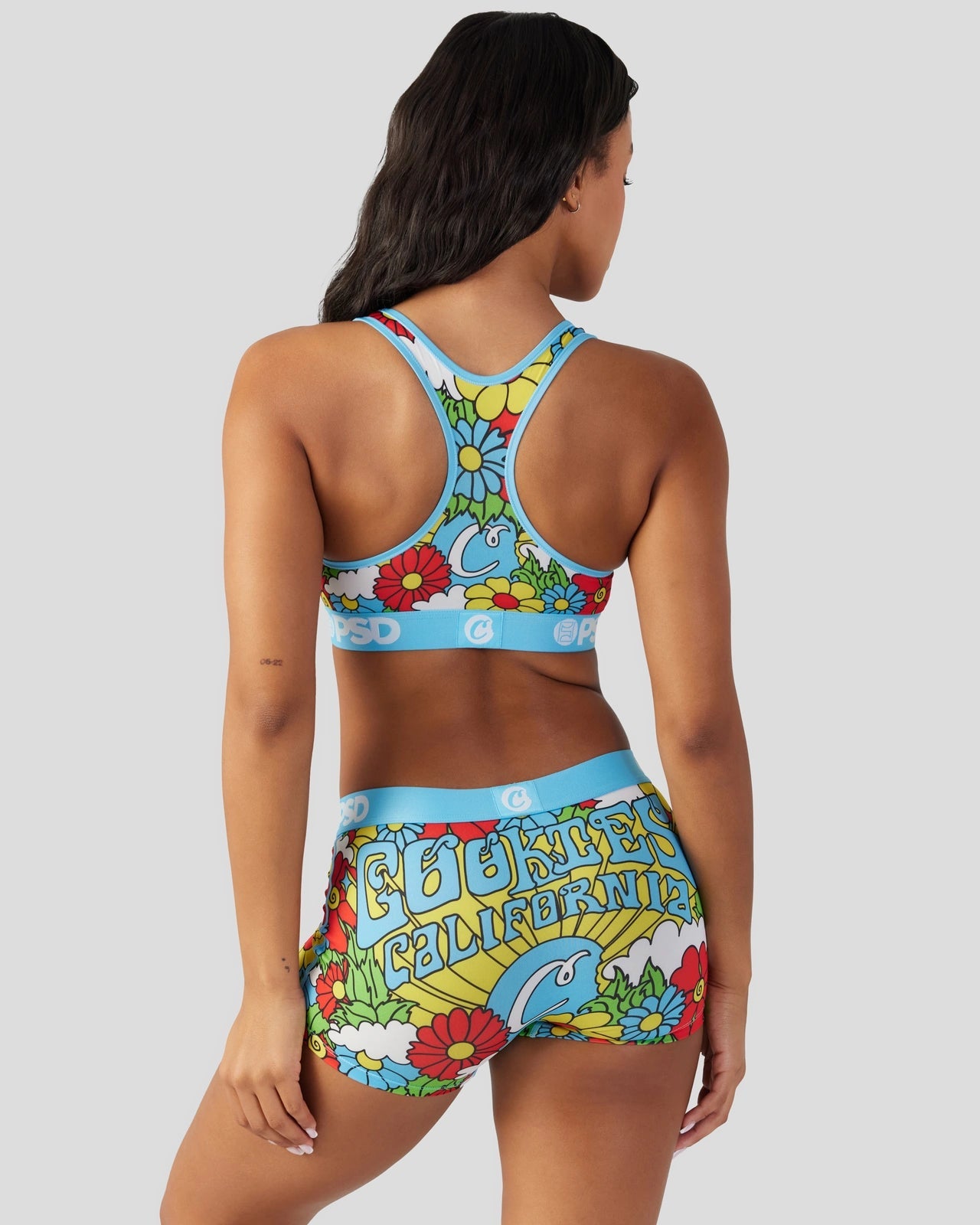 New from Cookies x PSD! With a colorful retro print. the Cali Cookies Sports Bra is made from a silky poly blend with a comfortable full coverage. keep-you-in fit. The PSD boy shorts are perfect for everyday wear and working out.