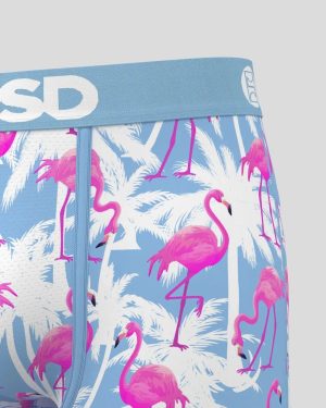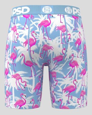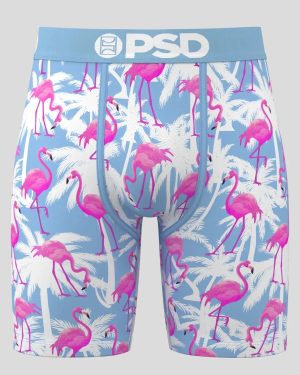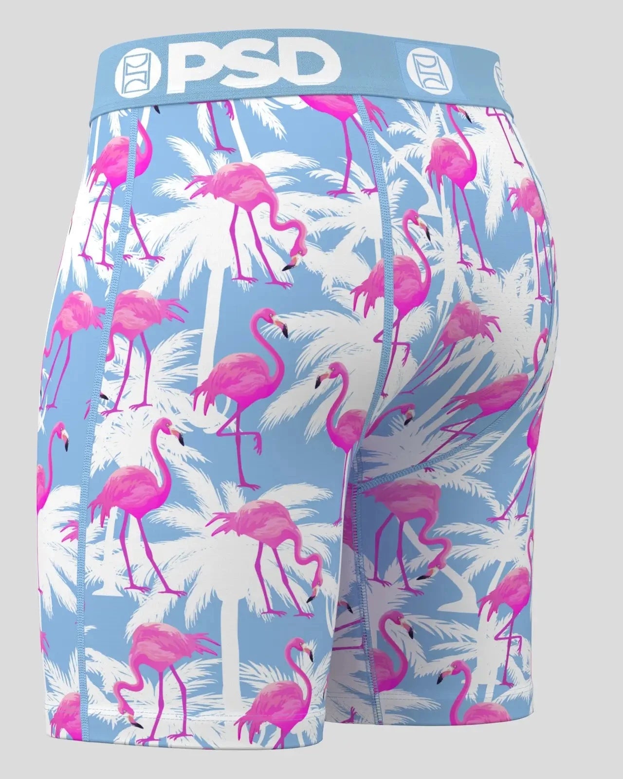 Featuring palm trees and bright pink flamingos set to a blue background. this new pair is like wearing a vacation. The Flamingo Palm Sky briefs include our ultra-comfortable Signature WaistBand. a breathable MicroMesh pouch. and four-way stretch. The PSD 7 Standard Length Briefs won’t roll or ride and were built for everything. from everyday wear to your toughest workouts.