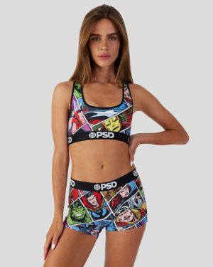 Featuring a retro comic strip. this Marvel Comics bra design includes images of beloved characters from the comic book like Dr. Strange. Captain America. Iron Man. and Ant-Man. Made with our silky poly blend. the Sports Bra is breathable yet slightly compressive. the perfect bra bringing you the comfort. style. and support you need for everything you get into.