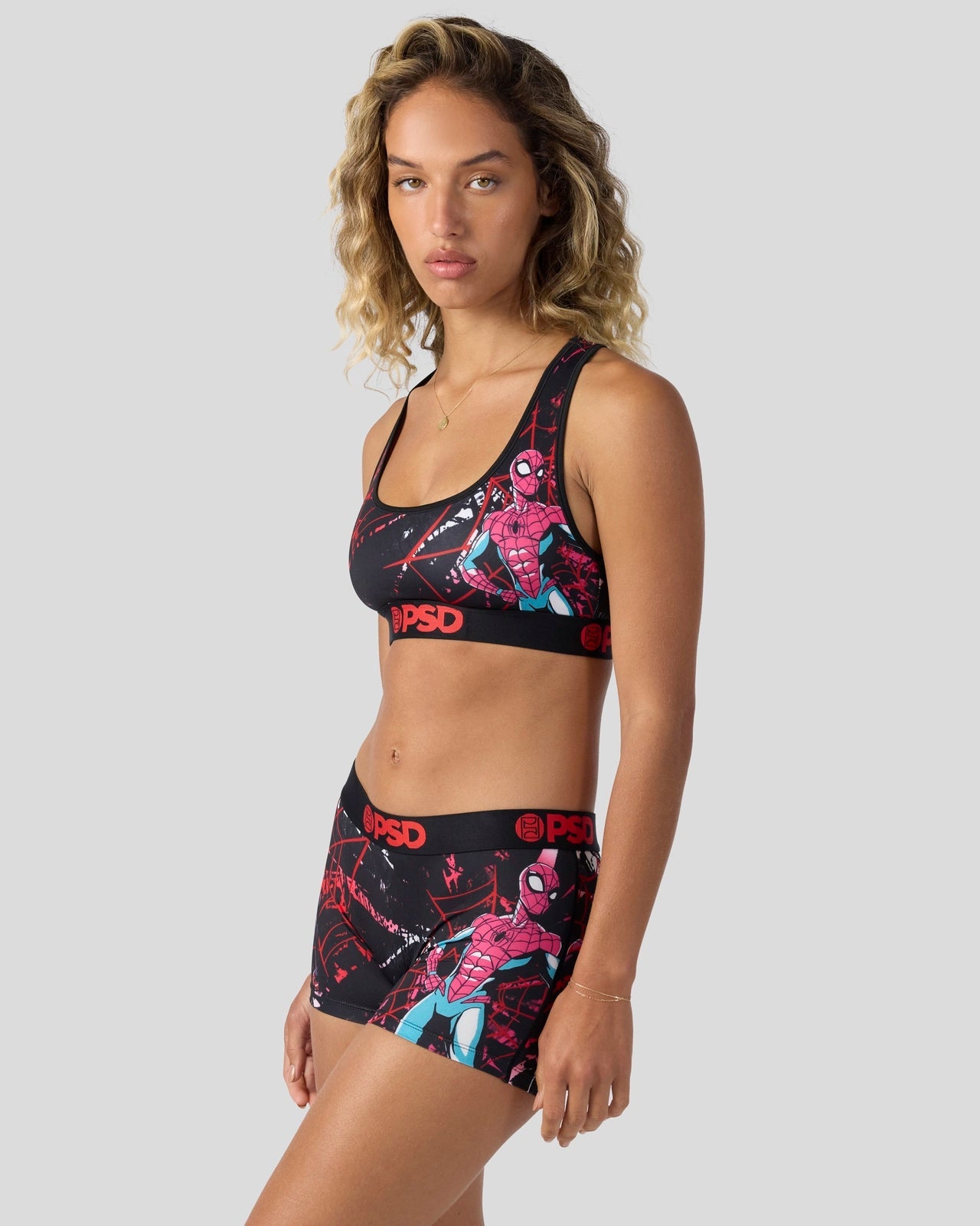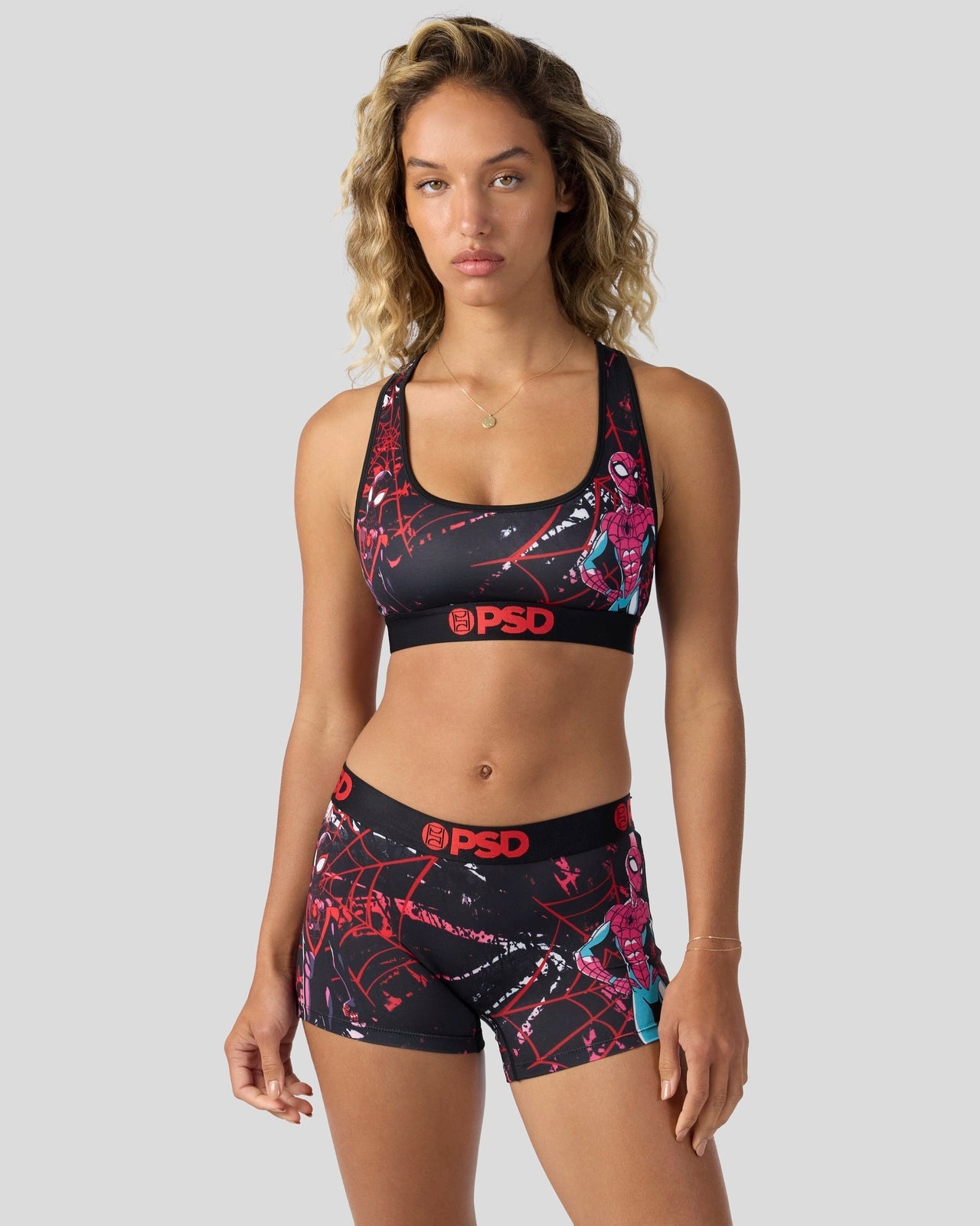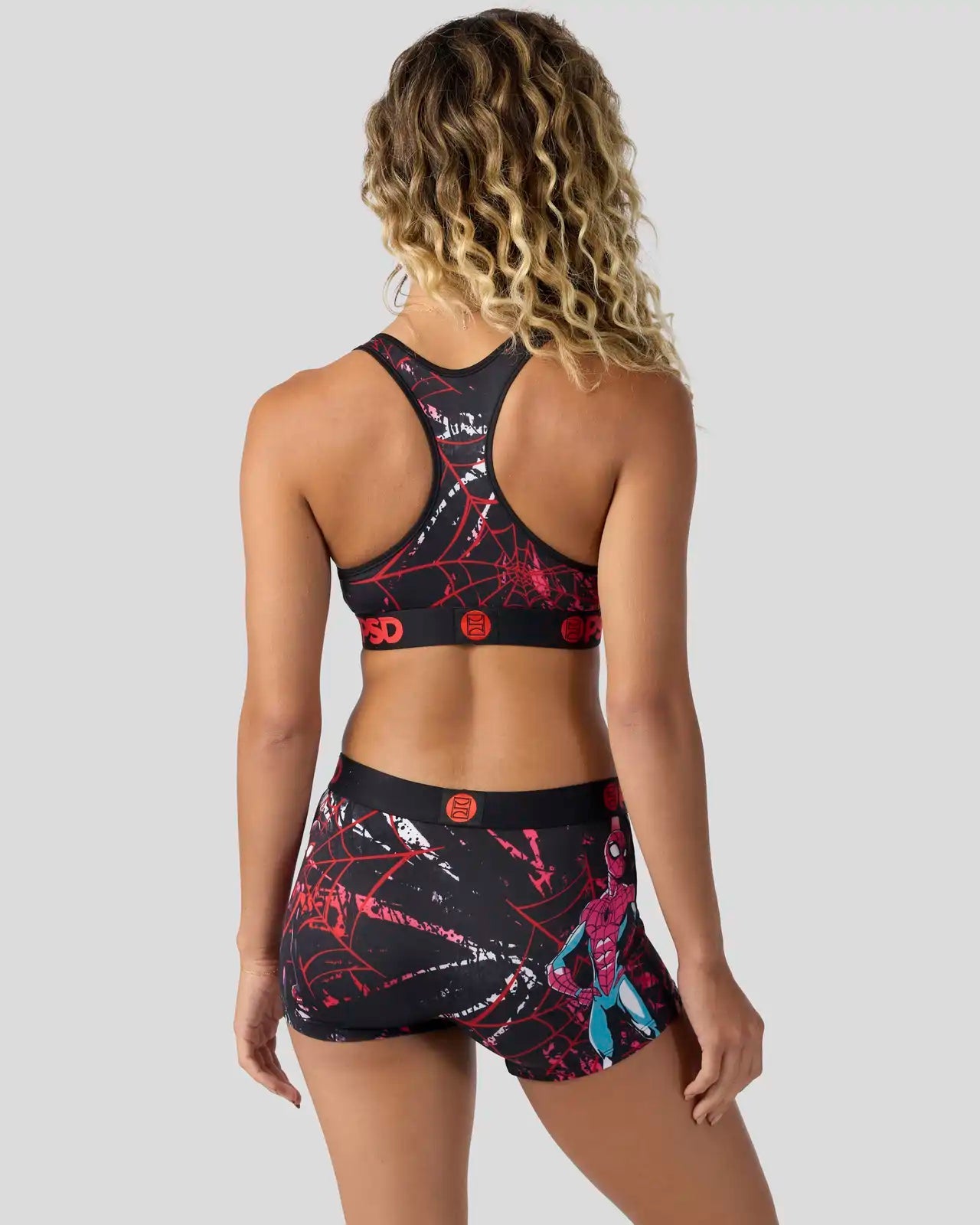 You’re not seeing double. Swing into new with this new Marvel pair featuring the spider duo. The Spider Bros Sports Bra is made from a silky poly blend and is breathable yet slightly compressive. bringing you the comfort and support you need for everything you get into.